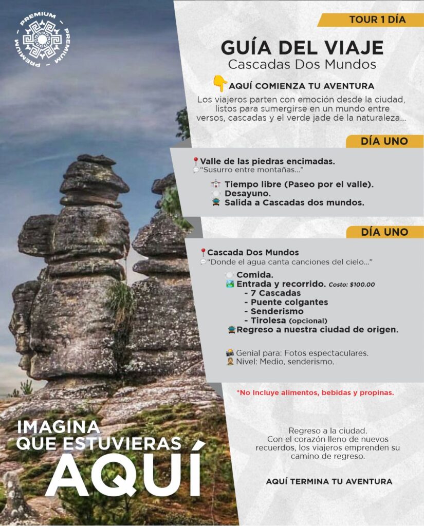 Con altas cascadas que caen sobre estanques naturales de aguas cristalinas, fabulosas vistas desde un puente colgante de 100 metros de largo y la visita a algunas cavernas entre las montañas donde la creencia local asegura que viven criaturas mitológicas, el centro turístico Dos Mundos (también llamado ‘Huetziatl’ que significa ‘lugar místico’), se encuentra a unos 25 minutos desde la cabecera municipal de Acaxochitlán.