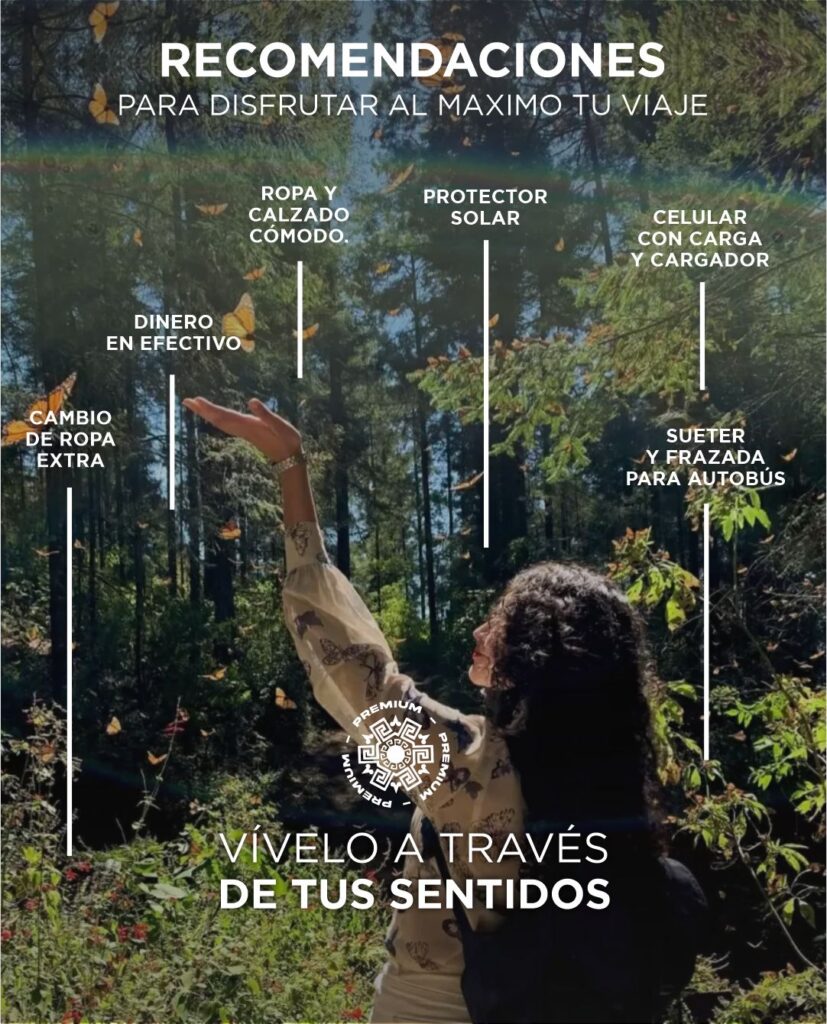 Al llegar a las colonias podrás admirar los vuelos de las Mariposas Monarca, esto sucede cuando los rayos del sol bañan las puntas de los pinos donde ellas se encuentran y el calor del sol las despierta para que puedan volar por todos lados incluyendo frente a tu nariz.